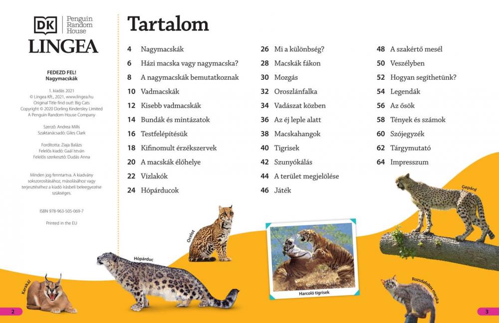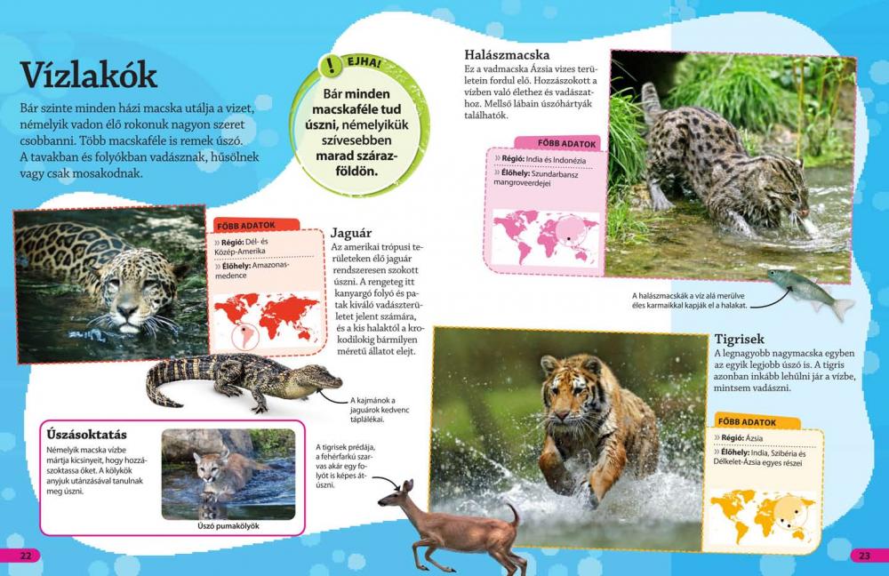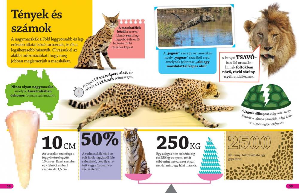 A gyerekeknek szóló könyv telis-tele van érdekességekkel, meglepő tényekkel és gyönyörű képekkel. Lenyűgöző módon mutatja be a nagymacskák életét és környezetét. Megtudhatjuk például, hogy miért olyan kiváló vadászok az oroszlánok, a tigrisek és a jaguárok, miért a gepárd a leggyorsabb állat a világon, de azt is, hogy melyik macskafélék tudnak kiválóan úszni.