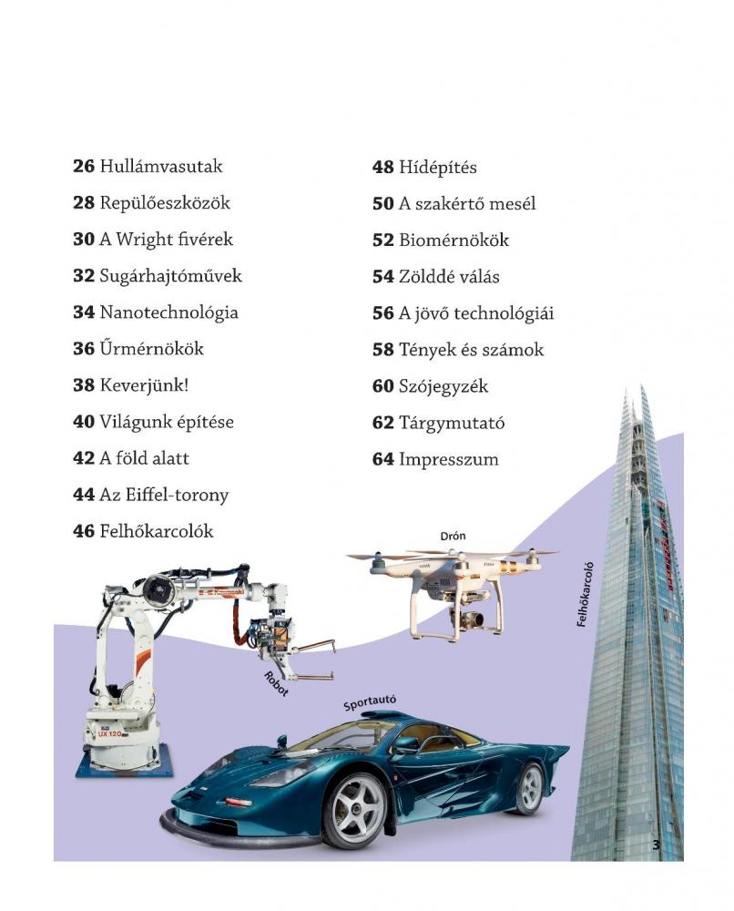 A könyv lenyűgöző betekintést nyújt a technikai találmányokkal teli világba. A gyerekek megtanulják, hogy hol és milyen széles körűen találkozhatnak a technikával, és az hogyan segíti életünket. A tények, képek és sok érdekességen kívül a könyv végén található fogalomtár számos kifejezést megmagyaráz, mint például a szélcsatorna, a hidraulikus erő vagy az optikai kábel.