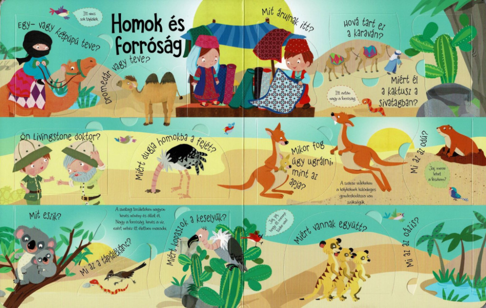 A vadállatok rejtélyeiHogyan vadászik az oroszlán? Miért vonyítanak a farkasok? Miért van csíkja a zebrának? A könyv betekintést nyújt a ragadozók és növényevők életébe, bemutatva a tápláléklánc működését és az állatok közötti kapcsolatokat. A különleges élőhelyek lakóiA könyv bemutatja az állatokat a dzsungelből, a sivatagból, a sarkvidékekről, a szavannáról és az óceánok mélyéről. Megtudhatjuk, hogyan alkalmazkodnak az állatok a környezetükhöz, például miért van zsírtartalék a tevék púpjában, vagy miért élnek a majmok a fákon. Érdekes állati viselkedésekMiért alszanak fejjel lefelé a denevérek? Hogyan kommunikálnak a bálnák? Miért változtatja a színét a kaméleon? A könyv részletesen bemutatja az állatok szokásait és rejtett képességeit. A tenger mélyének titkaiAz óceánok tele vannak különleges élőlényekkel, mint például a delfinek, a cápák és a bálnák. A könyv bemutatja, hogyan táplálkoznak, hogyan mozognak, és miért képesek egyes állatok a víz alatt lélegezni. A legnagyobb, leggyorsabb és legfurcsább állatokMelyik állat a leggyorsabb? Melyik madár repül a legmagasabbra? Ki az állatok királya? A könyv rekorder állatokkal ismerteti meg a gyerekeket, bemutatva a természet elképesztő sokszínűségét.