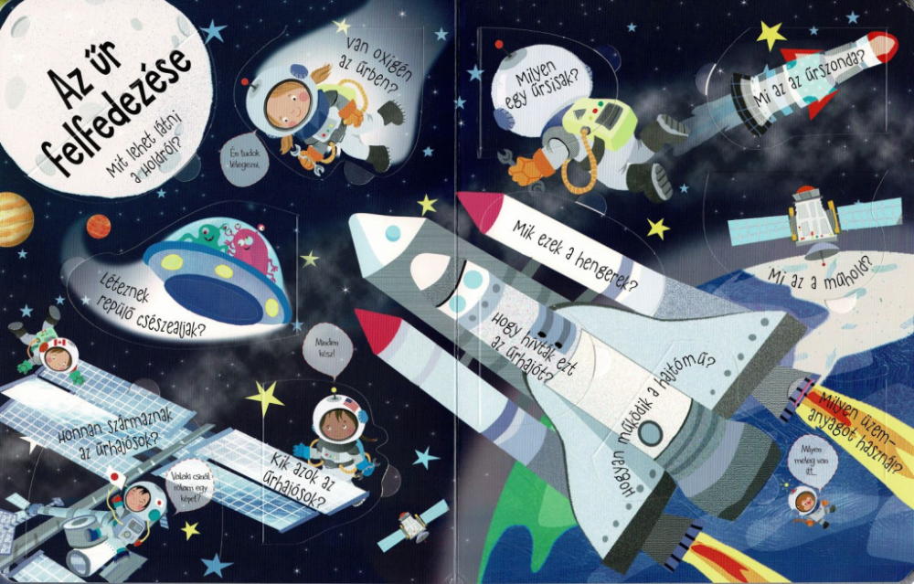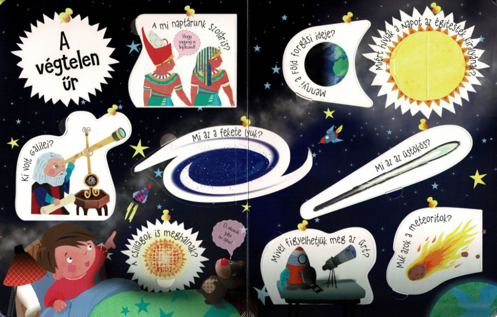Ez a könyv nem csupán egy egyszerű ismeretterjesztő olvasmány, hanem egy interaktív felfedezés, amely segít megérteni a világegyetem működését. A kíváncsi gyermekek választ kaphatnak olyan kérdésekre, mint: Mi az a fekete lyuk? Hogyan működik egy űrhajó? Hogyan születnek és halnak meg a csillagok?