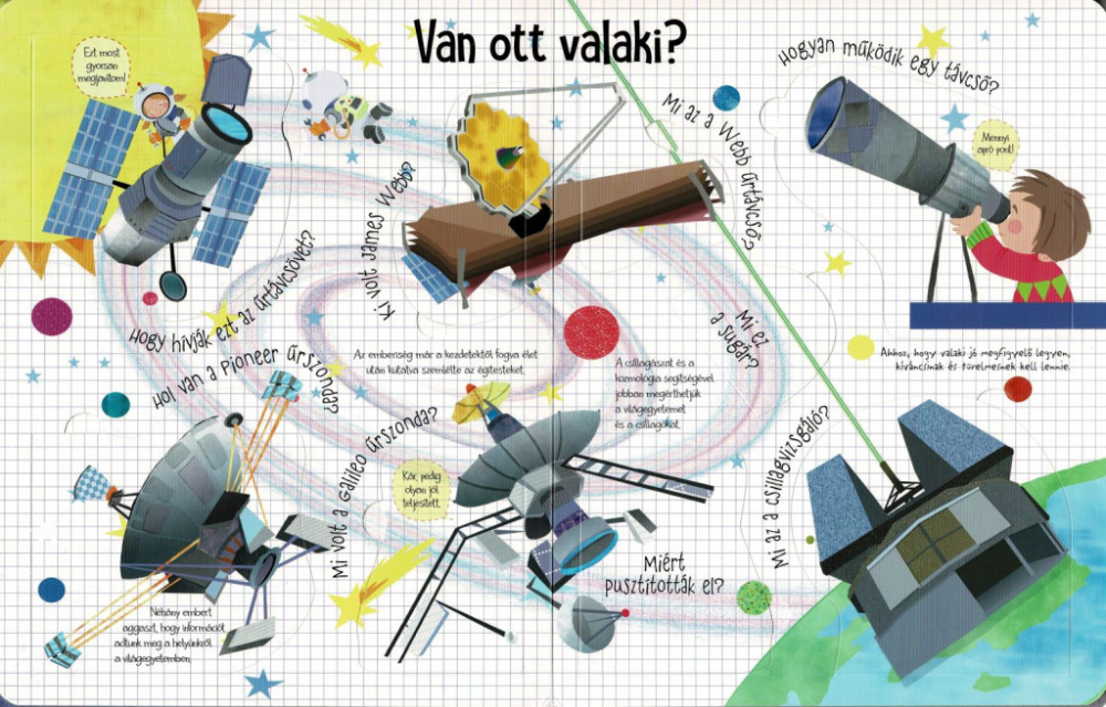 A világegyetem és a csillagokMiért ragyognak a csillagok? Hogyan keletkeznek és halnak meg? Mi az a fekete lyuk? A könyv segít megérteni a csillagok életciklusát, a galaxisok működését és az univerzum titkait. A Naprendszer bolygóiMiért vörös a Mars? Miért van gyűrűje a Szaturnusznak? Hogyan befolyásolja a Nap a bolygókat? A könyv bemutatja a Naprendszer bolygóit, azok különleges tulajdonságait és a közöttük lévő különbségeket. Űrutazás és űrkutatásKik azok az űrhajósok? Hogyan készülnek fel egy űrutazásra? Mit csinálnak az űrállomáson? A gyerekek betekintést nyerhetnek az űrhajósok életébe, megismerhetik a Nemzetközi Űrállomást, az űrrepülőgépeket és az űrszondák működését. A Hold és az emberiség első lépései az űrbenHogyan juthatunk el a Holdra? Ki lépett először a Hold felszínére? Miért vannak kráterek a Holdon? A könyv részletesen bemutatja az Apollo-programot, a holdraszállást és az űrhajósok kalandjait. A jövő űrkutatása és az élet kereséseLehetséges, hogy valaha emberek élnek a Marson? Léteznek földönkívüliek? Hogyan működik az űrturizmus? A könyv megmutatja a legújabb tudományos felfedezéseket és a jövő izgalmas terveit az űrkutatásban.