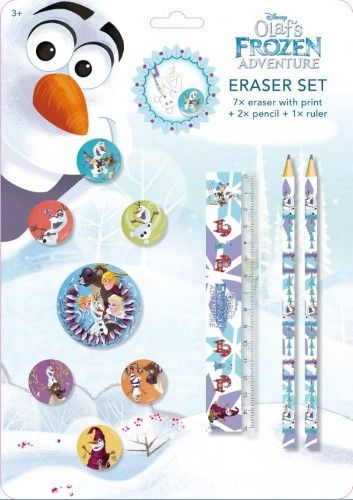 A kis Olaf hóember ezúttal radírra nyomtatva kísér el a suliba! Legyen a tiéd ez az aranyos szett, melyben a radírokon kívül grafitceruzákat és vonalzót is találhatsz!